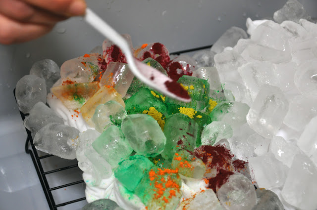 Cominciate con un cucchiaiono a cospargere casualmente il ghiaccio con piccole porzioni di colore. La tintura deve essere disposta in base al vostro gusto e alle varie gradazioni di colore che volete ottenere.